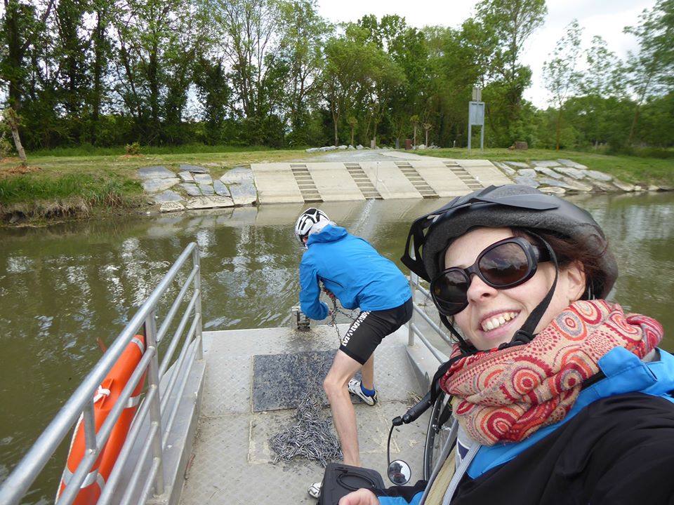 Nous décidons de passer par les ardoisières de Trélazé, ce qui nous réserve une bonne surprise, avec la traversée d’un cours d’eau sur un bac. Cette activité, si anodine, nous change tellement du quotidien que nous l’avons pleinement appréciée.