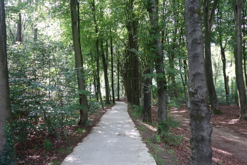 Aux Pays-Bas, une piste cyclable parfaite serpente à travers les arbres en pleine forêt