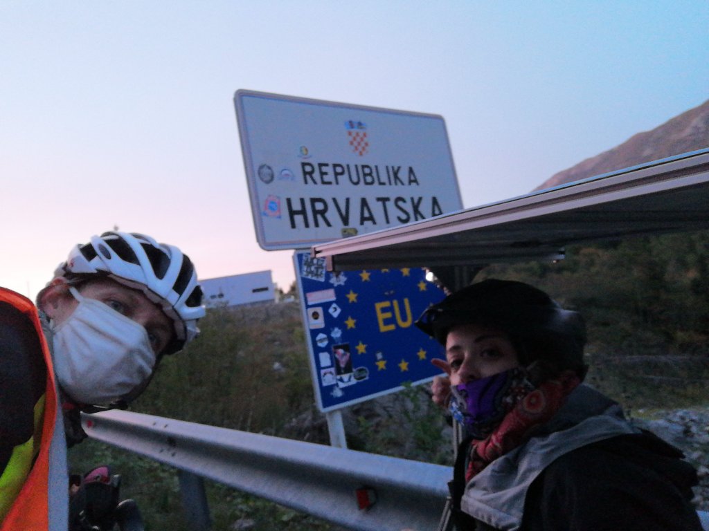 Juste avant la frontière, nous remplissons le formulaire entercroatia. Globalement il suffit de réserver un hôtel pour la première nuit pour avoir le droit d’entrer (dommage, nous avions un hôte warmshowers prêt à nous accueillir dans son jardin après la frontière). Puis, il suffit d’indiquer l’adresse et générer le formulaire, afin d’avoir un numéro à donner au poste frontière. Nous n’avons pas cherché à jouer, ne sachant pas s’il y avait un contrôle après. Nous n’étions pas vraiment sûrs de pouvoir rentrer, car le site reopen parlait de membres de l’UE depuis des pays de l’UE. Nous n’avons pas trouvé d’informations officielles sur des membres de l’UE rentrant en Croatie depuis un pays hors UE. Mais des voyageurs l’ayant fait avant nous, nous nous sommes dits que ça passe. Et ça passe ! Nous avons de la chance, la Croatie est, avec la Bulgarie, un des deux seuls pays de l’UE dont les frontières terrestres avec des pays en dehors de l’espace Schengen sont ouvertes.