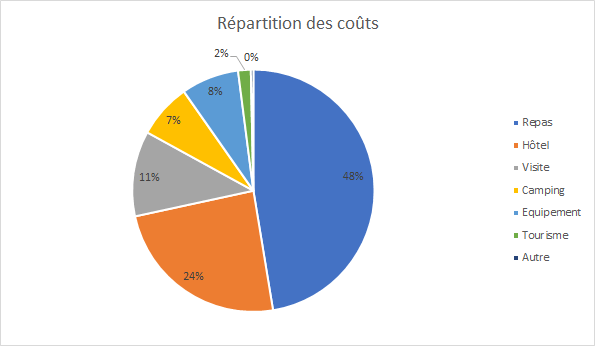 Au total nous avons dépensé 4400€ pendant le voyage (sans les vélos et l’équipement de départ). La plus grande partie des dépenses a été la nourriture, pour près de la moitié. Viennent ensuite les hôtels, très inégalement répartis sur la durée de notre voyage. Le gros quart restant est réparti pour moitié par des visites touristiques et l’achat de quelques rares souvenirs (épices, musique), et l’autre moitié par les campings et l’équipement manquant (principalement la réparation du réchaud et l’achat des vêtements de pluie qui nous manquaient).