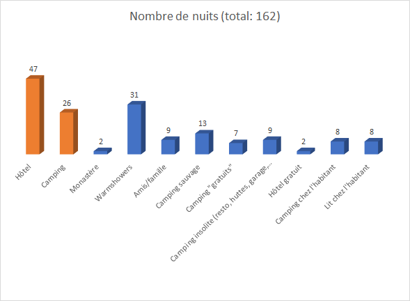NB: à noter que nous avons été surpris par la quantité d’hôtels dans lesquels nous avons dormi: il a fallu 45j pour notre premier hôtel Sur le retour, et notamment en Europe de l’Est, les prix étaient si bas que parfois nous préférions prendre un hôtel, notamment dans les grandes villes, mais également car parfois, après avoir vécu deux ou trois très belles expériences, nous avions ce besoin qui peut sembler paradoxal de juste se retrouver à deux, écouler notre nourriture, et surtout recharger nos esprits après certains aurevoirs plus durs que d’autres