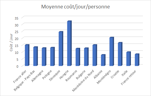 Sans doute le bilan le plus aisé à réaliser, et pourtant celui qui pour nous reflète le moins le voyage. Nous n’avons pas cherché à économiser à tout prix, et ne nous sommes pas lancés dans une course au budget le plus faible. Ce n’est pas notre vision du voyage. Et comme nous avions prévu un budget pour 14 mois, avec de nombreux visas payant, le passage à un séjour en Europe de 6 mois a forcément beaucoup réduit les coûts. Nous ne voulions pas dormir toutes les nuits en hôtel (que nous avons évité au maximum, sauf dans les grandes villes d’Europe de l’Est), souhaitant le contact avec les locaux; mais dans le même temps si nous avions envie d’une gauffre ou d’une glace à 16h, nous craquions plutôt que de nous limiter à nos barres de céréales / pain (et c’étaient toujours de bons investissements, comme vous pouvez voir!)